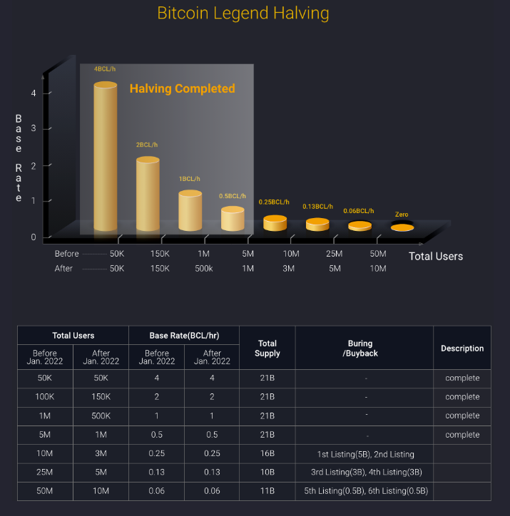 Bitcoin LegendはスマートフォンでAPPマイニングができるだけでなく、アバターNFTやアイテムNFTの製作及び販売、そしてNFTカードを使ったメタバースゲームとして進化していくMine to Earn / Make to Earn / Play to Earn の3 Earn Strategy Projectです。GameFiとしてはそのゲームワールドはかなり大規模なものだと考えられます。メタバースでのアバターによる不動産売買や賃貸での経済活動、NFTカードが "1 on 1" で戦う競技場でのバトルを放映する放送チャンネルなども用意されると言われています。現在動いている次世代GameFi・仮想通貨候補の中で、こと仮想空間での生活という点においては、このBCL Networkが最も壮大な絵を描いているようにも思えます。APPマイニングのユーザー数260万人以上で、現在はロードマップのフェーズ4を進捗中です。