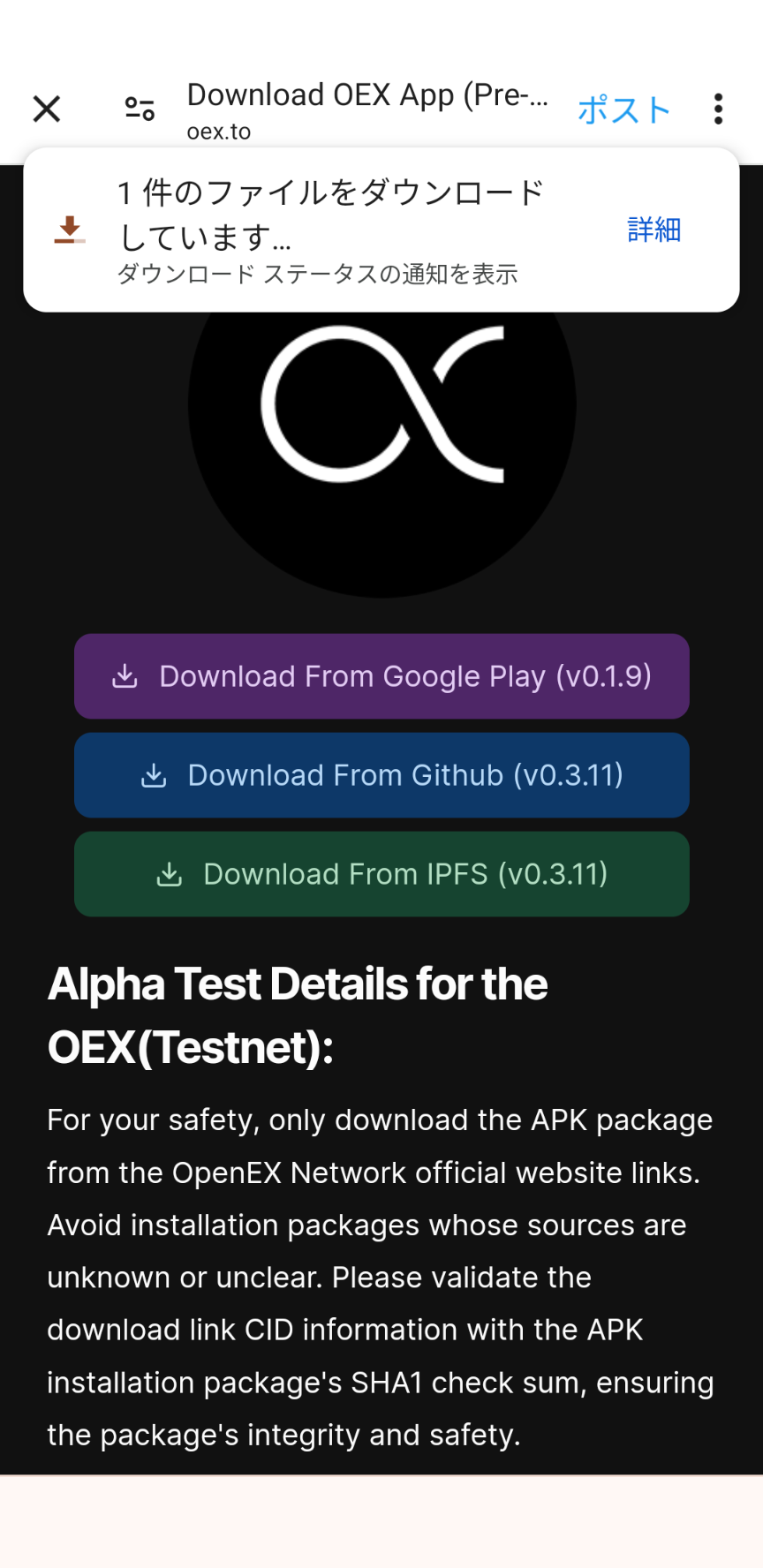 上記リンクの飛び先で、GooglePlayを除いたv0.3.11が選べるGithubかIPFSからダウンロードします。