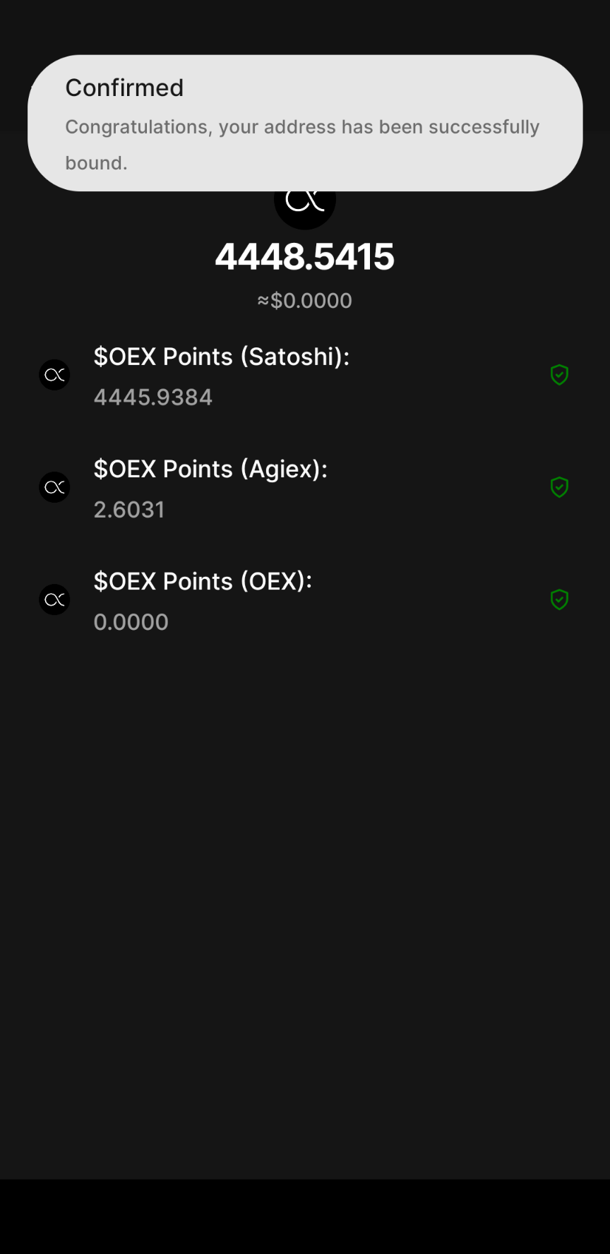 また、新しくOEX points(OEX)という表示も増えたので、これは恐らくアプリ内でのSwapやTEAM invite関係のポイントプログラムだと思われます。