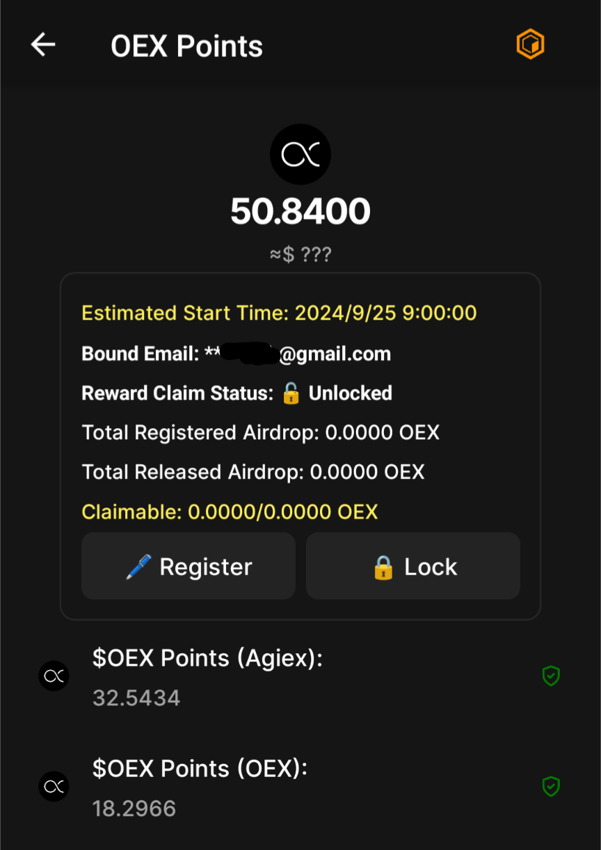 OEXコミュニティの誰もが気になるのはやはりTGE、そしてAirdropです。OEX Pointsタブを見てみると、最新のOEXAppではこれまで表示されていたSatoshiAPPでのAirdrop獲得量はマスクされています。