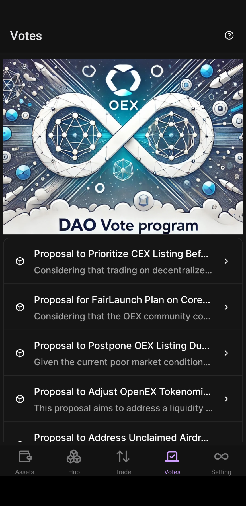 v1.0.7までのOpenEXロゴNFTより派手になっているアイキャッチが目立つ新しい実装機能、DAO Vote programの表示。度重なる増加拡大策を進める過程においてDevの中で序列変更があったこともあり、DAOということを強く打ち出しています。これはDevにとってもコミュニティにとっても悪くない方向だと思います。