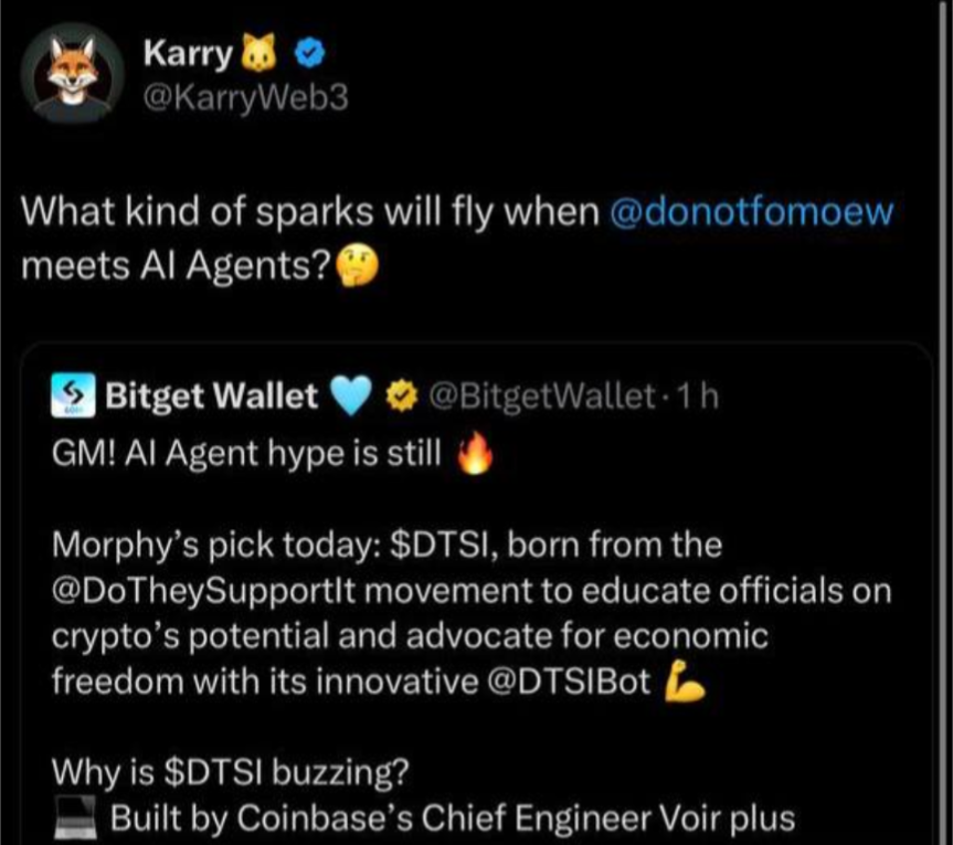既にこの1週間ほどでかなり盛り上げられてしまっている新しいBlockchain / 仮想通貨界隈でのトレンド、「AI Agent」を強く匂わせる一文です。そして、リプライはBitget公式アカウントのPostに対して行われている為、中の人がもしかしたら一緒なのでは!?というくらい近しい距離間でのやり取りなのです。