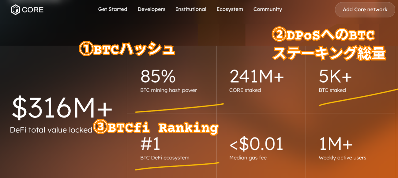 - ③BTCfi Ranking #1: これはCoreDAOが「Bitcoin Aligned Chain」のカテゴリーでランキング1位であることを示しています。少し恣意的な数字にも見えますが、CoreDAOがBitcoinエコシステムの中で中心的な役割を担っているという、彼らの強い意志の表れと捉えることができます。